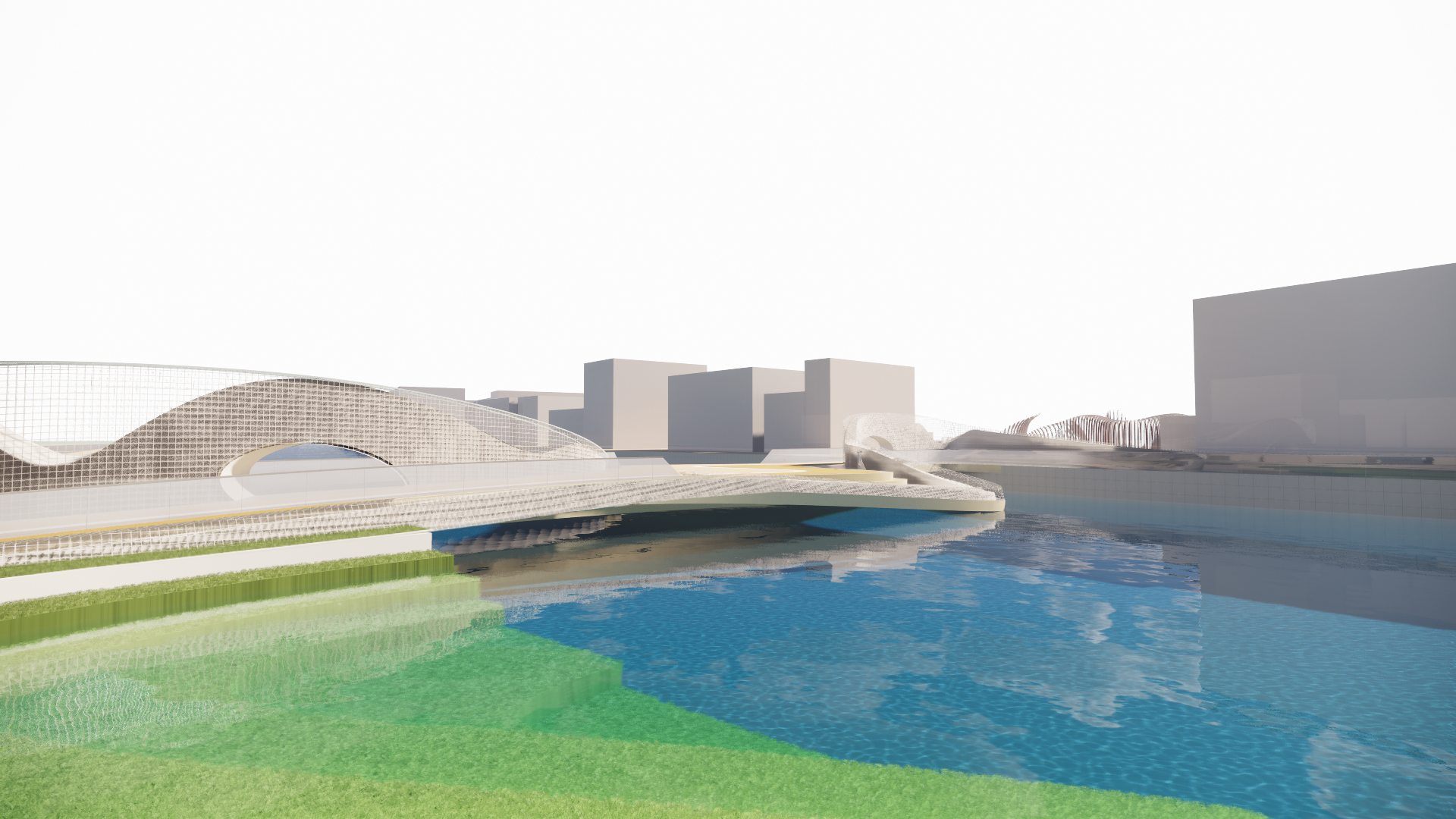 该设计桥梁位于深圳大鹏所城与较尾场之间,大鹏所城南门中轴线上,鹏飞路南侧。该桥东西走向,跨度约四十多米,河水清澈河道两侧自然生态迷人,可在桥的东西两侧观看日出日落。