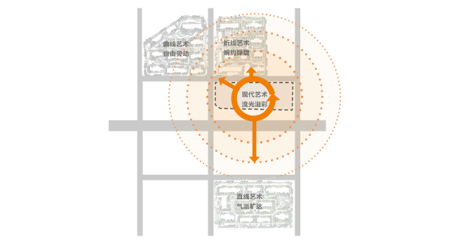 设计策略以艺术作为商业引爆点以点带面。由艺术中心/商业向住宅发散热点,激活商业活力、带动片区发展的同时为住宅注入艺术体验。片区形成以商业互动的现代艺术,进而渗透到新中式住宅的中式意境。