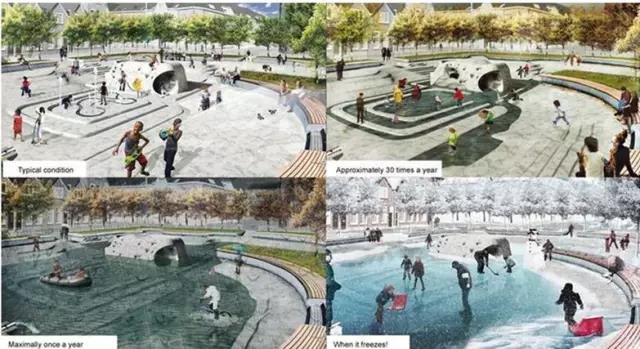 以一个公共休闲场所为案例,对不同季节带来的环境变化进行利用,以水资源利用为例,从结冰到不同蓄水量的应用,呈现出四季变幻的城市景观。