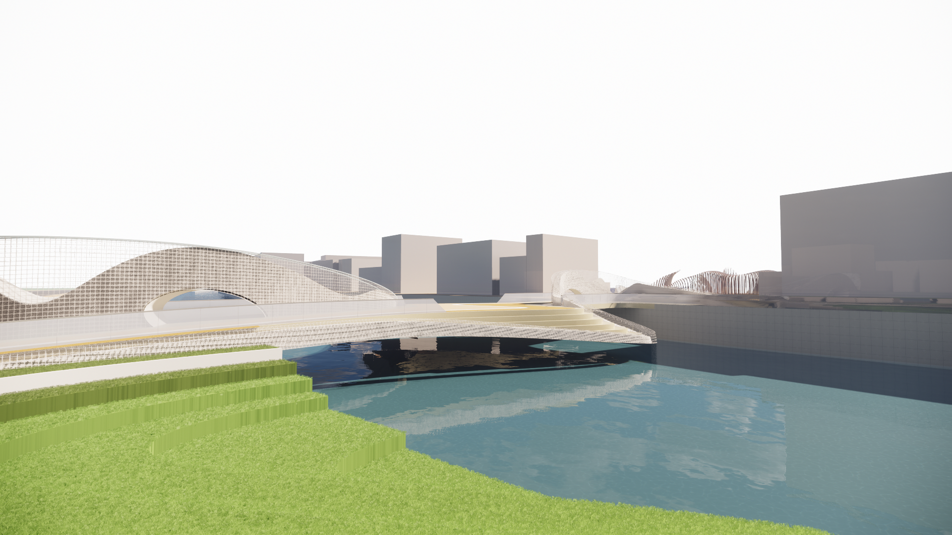 该设计桥梁位于深圳大鹏所城与较尾场之间,大鹏所城南门中轴线上,鹏飞路南侧。该桥东西走向,跨度约四十多米,河水清澈河道两侧自然生态迷人,可在桥的东西两侧观看日出日落。