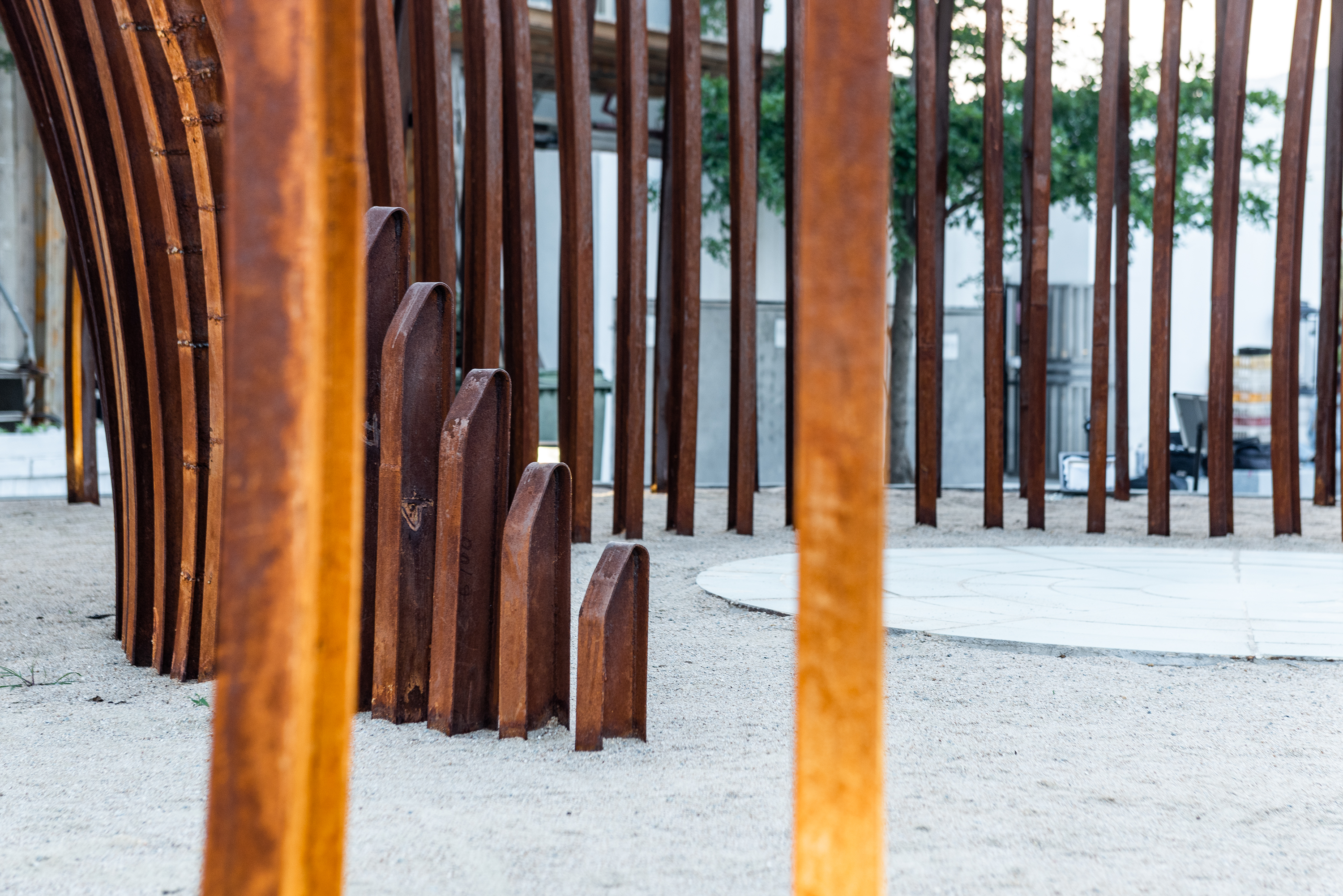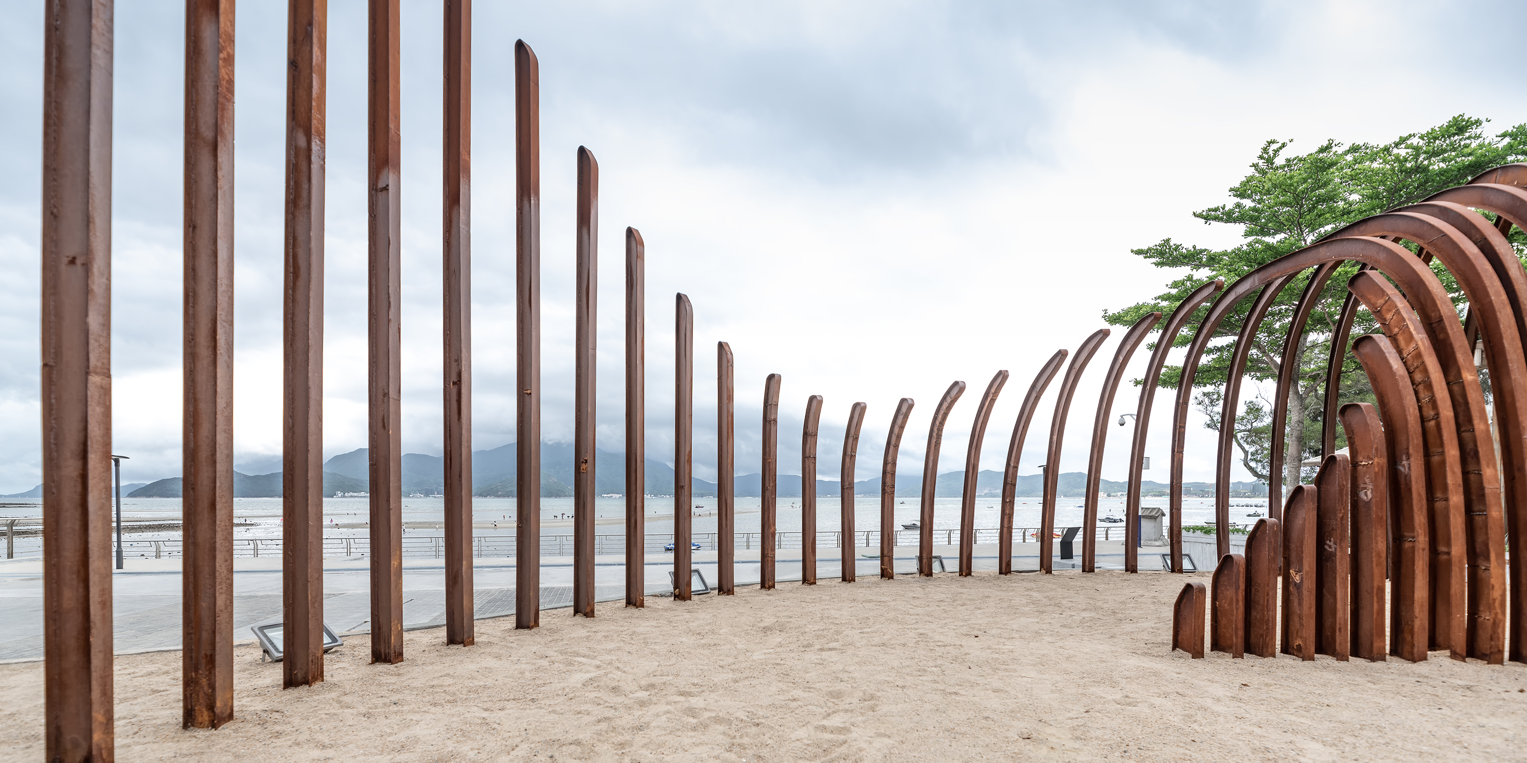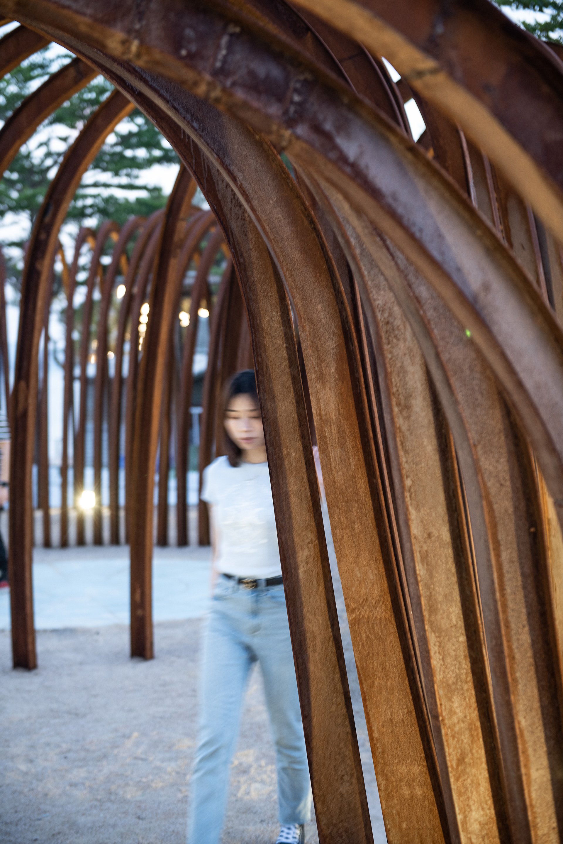 “海之韵”设计突显了工业空间的特色:采用耐候钢为整个装置的造型主元素,外形轮廓模拟海浪冲刷形态。未经修饰的耐候钢龙骨,犹如航行百年,船身经历海浪侵蚀后残留下的船架,斑驳锈迹,具有浓郁的历史色彩。龙骨的汇集型线条引导观众进入装置内部,耐候钢与海沙形成了一个粗糙又统整的美感,历史与生态的元素相互穿插,呼应大鹏的海滩印象,同时形成了极具文化氛围的展示空间。